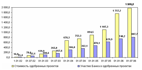 С начала деятельности Банком одобрены к финансированию 40 инвестиционных проектов на сумму на сумму 1 466,6 млн. долларов США с участием Банка на сумму 581,6 млн. долларов США, в том числе за 1 полугодие 2006 года – 4 проекта на сумму 53,7 млн. долларов США с участием Банка – 31,0 млн. долларов США.