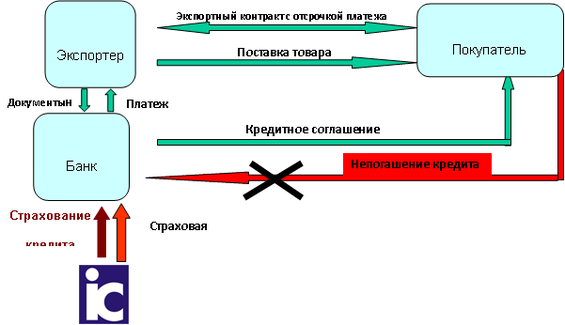Каждый продукт имеет свою отличительную черту и соответственно схему реализации. Например, страхование кредита покупателю предполагает защиту Банка экспортера от риска неплатежа со стороны покупателя вследствие коммерческих/политических рисков по кредиту, предоставляемому Покупателю для оплаты экспортного контракта.