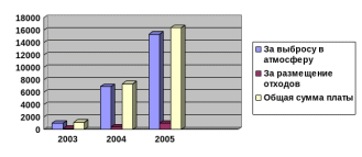 Таким образом, приведенные данные указывают на то, что платежи за выбросы в атмосферу и за размещение отходов, а соответственно и общая сумма платежа возрастают с каждым годом в 2 раза. Это связано с износом оборудования, с отсутствием у предприятия средств на приобретение очистных сооружений, т.к. прибыль предприятия является величиной отрицательной.