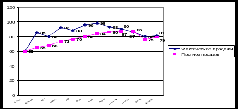 | Месяц | Фактические продажи | Прогноз продаж | |||