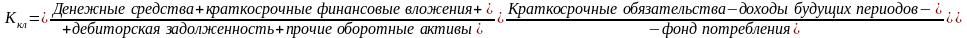 коэффициент «критической» (быстрой) ликвидности (Ккл) - показывает, в какой мере все текущие обязательства могут быть удовлетворены за счет активов в ликвидной форме и быстрореализуемых активов:
