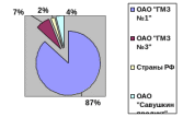 Данные таблицы свидетельствуют о том, что в 2005году реализовано продукции на сумму 16170 млн.руб. Из них прочая реализации составила 5,1%; экспорт- 2,66%.