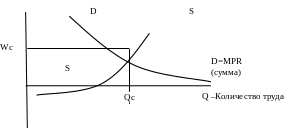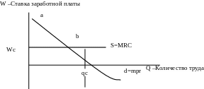 Равновесная ставка заработной платы и равновесный уровень занятости данного вида труда определяется на пересечении кривых предложения и спроса на труд. На рисунке 1.2 равновесная ставка заработной платы - Wc, а количество нанятых рабочих Qc.