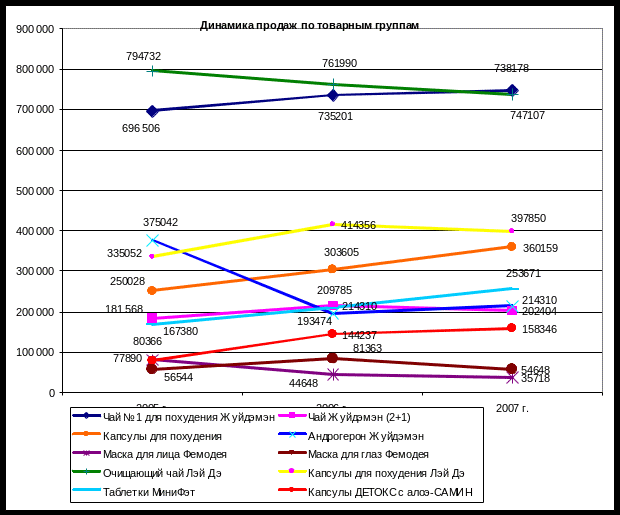В структуре реализованной продукции в 2005 г., в 2006 г. и в 2007 г. основное место занимал Очищающий чай Лэй Дэ соответственно 26,36 %, 24,56% и 23,34 %, в 2007 г. доля Лэй Дэ упала в связи с тем, что удачно проведенная рекламная кампания капсул для похудения Лэй Дэ и капсул ДЕТОКС с алоэ-САМИН существенно повысила долю продаж данных товаров с 11,11 % до 12,58% и с 2,58% до 5,01 % соответственно для каждого наименования. Также немного отстает от показателей чая Лэй Дэ чай №1 для похудения Жуйдэмэн: 23,1% - в 2005 г., 23,69% - в 2006 г. и 23,63% в 2007 г. Как видно из таблицы 2.3. и рисунка 2.2. продажа этого чая в основном стабильна по годам, но в 2007 г. удельный вес продаж в общем объеме снизился на 0,03%.