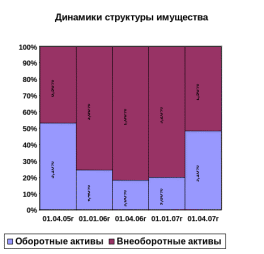 На 01.01.2007 общая стоимость имущества несколько увеличилась (на 3,9 %), причем наиболее высокими темпами увеличивались оборотные активы (на 14,2 %) и на 1,7 % - внеоборотные активы. По структуре на 1,8 % произошло увеличение доли оборотных активов.