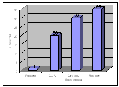 О слабом уровне развития кредитования малого предпринимательства в России можно сделать вывод на основе ниже представленного рисунка 3.2. Из которого видно, что доля кредитов выдаваемых малому бизнесу в ВВП в России (1%) значительно ниже по сравнению с США (20%), странами Евросоюза (30%) и Японией (35%). По уровню поддержки малого и среднего бизнеса Россия находится на 148-м месте.
