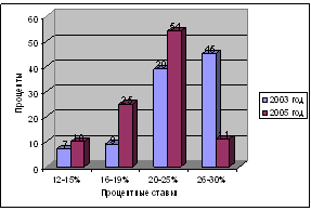 При этом 95% кредитов, полученных респондентами, не превышают 10 миллионов рублей. Существенную часть (около 40%) составляют кредиты до 500000 рублей. В основном, это краткосрочные кредиты. В 2003 году 84% респондентов получили кредиты по ставкам, превышающим 20% годовых, а в 2005 году уже 65%, причем с заметным перевесом в сторону кредитов выданных под 20-25% годовых. (рисунок 3.6).