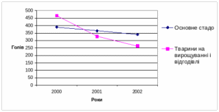 Аналізуючи таблицю 2.6 6., ми бачимо, що об'єм виробництва продукції тваринництва з кожним роком зменшується, так у 2000 році він склав 291,2 тис. грн., у 2001 р. – 246,2 тис. грн., у 2002 р. – 222,6 тис. грн. . у порівнянні з 2001 роком у 2002 році цей показник знизився на 9,6%.