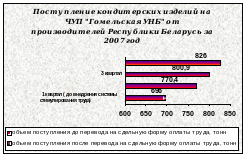 Как показывает рисунок 9 поступление кондитерских изделий на ЧУП «Гомельская универсальная база» от отечественных производителей за счет перевода на сдельную оплату труда составило 826 тонн и увеличилось по сравнению с 1 кварталом 2007 года (до внедрения стимулирования труда) на 130 тонн.