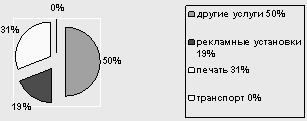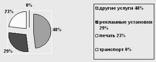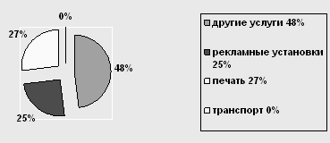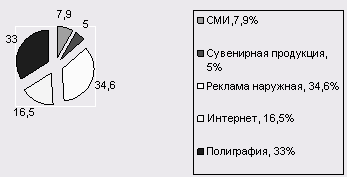 Из таблицы 2.5 и рисунка 7 видно, что наибольшее число организаций работают в сегменте наружной рекламы – 34,6 % и полиграфии – 33 %. На эти рекламные носители очень большой спрос, и они являются у большинства фирм основными видами деятельности.