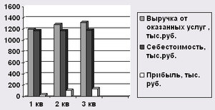 Из таблицы 2.1 и рисунка 2, мы видим, что в первом квартале 2009 года, прибыль составила всего 27,13 тыс. руб. если посмотреть на экономические показатели работы рекламного агентства за 2008 год (см. прил.1), можно сказать, что происходило существенное снижение прибыли. При этом выросла и себестоимость. Связано это с повышением цен на электроэнергию, материалы, увеличение арендной платы и другие внешние факторы. Но уже со второго квартала 2009 года прибыль рекламного агентства начинает возрастать. И в третьем квартале она составляет 131,44 тыс. руб. Обусловлено это приобретением собственной производственной базы (широкоформатная печать, интерьерная печать, фрезерно-гравировальные работы, плоттерная резка, печатное производство), которая намного позволяет сократить себестоимость.