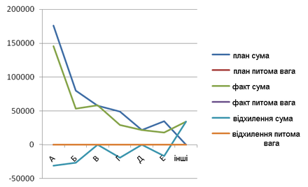 При аналізі продукції видно, що лише дві групи В і Д майже відповідають плану, а значить підприємство зможе швидко реалізувати і підучити дохід від цих груп.