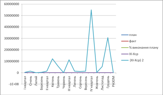 | місяці | план | факт | % виконання плану | ХI-Xср | (ХI-Xср) 2 |