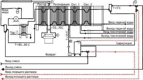 1. Рідка фаза суміші морозива подається в змішувальні ємності через секцію регенерації теплообмінного апарата. У всіх випадках, крім першого нагрівання першої зміни, відбувається регенерація тепла за рахунок теплообміну між надходить рідкою фазою і гомогенізований сумішшю з температурою 85 ° С йде зворотним потоком на охолодження. Рідка фаза нагрівається до температури в 40 ... 45 ° С.
