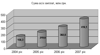 | Сума всіх виплат, млн. грн. | 156,3 | 219,6 | 302,8 | 416,1 |