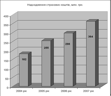 | Надходження страхових коштів, млн. грн. | 182 | 255 | 298 | 364 |