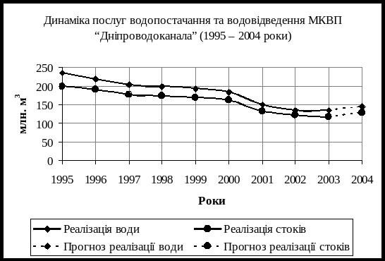Протягом восьми років, включаючи 2007 рік спостерігався спад виробництва питної води. За цей період споживання води зменшилось на 100 млн. м3, або на 43% (2000 р. – 235 млн. м3, 2007 р.- 135 млн. м3). У 2006 році спостерігався найбільш значний спад -35 млн. м3. Динаміка послуг водопостачання та водовідведення наведена у додатку А. Використавши дані таблиці, наведеній у додатку А, був побудований графік динаміки основних послуг по роках (рисунок 1.1), за допомогою якого наглядно простежується спад реалізації як води, так і стоків.