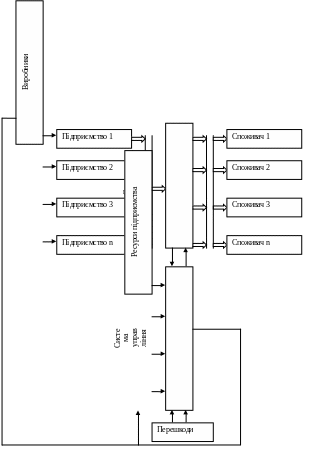Об’єктом управління на рисунку 1.4.1 є склад та ресурси підприємства. Склад приймає продукцію від виробника та розподіляє її, враховуючи ресурси підприємства, споживачам.