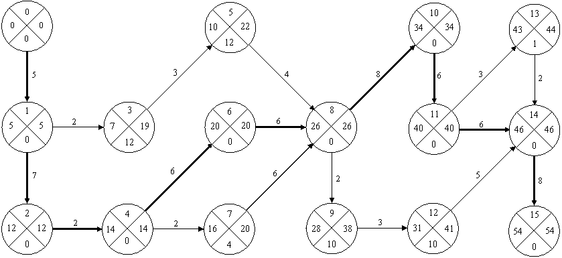 Критический путь обозначен жирными линиями и составляет 54 рабочих дня (рис.5.1).