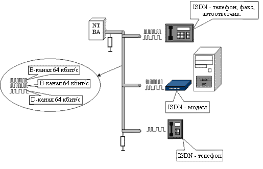 Информационный B-канал позволяет передавать любые данные абонентского оборудования. При наборе номера на ISDN - телефоне занимается один B-канал для разговора, а второй B-канал, может быть занят передачей данных со скоростью 64 Кбит/с через ISDN - модем. Для увеличения пропускной способности возможна организация передачи данных через два B-канала одновременно, этим самым, увеличивая общую пропускную способность до 128 Кбит/с. Канал сигнализации (D-канал) необходим для обмена служебной информацией с АТС (набор номера, входящий вызов и т.д.). В последнее время некоторые операторы связи организовывают средства передачи данных и по D-каналу (общая скорость обмена до 144 Кбит/с). Биты синхронизации символично выделены в отдельный канал пропускной способностью 16 Кбит/с, который не может быть использован для нужд абонента.