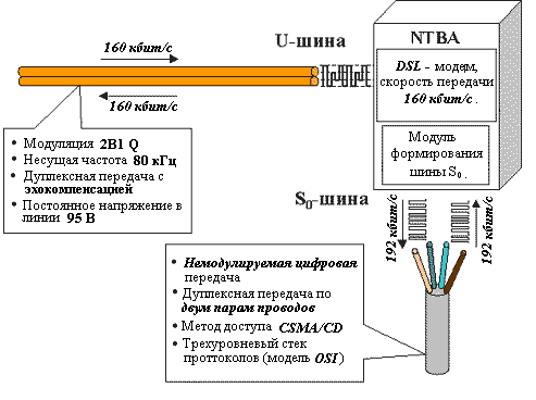 DSL – модем организовывает цифровую абонентскую линию с пропускной способностью 160 Кбит/с на обычном 2-х жильном телефонном проводе. Именно такая пропускная способность необходима для доставки к абоненту ISDN BRI (2×64Кбит + 16Кбит+16Кбит).