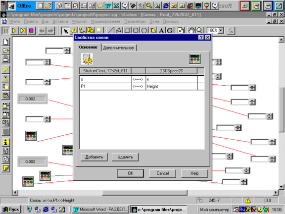 Проектування моделі починаємо в такій послідовності. Попередньо виберемо основний імідж, щовідображає рівень транспортної системи А. Це буде імідж типу StratumClass_726raf_ 611, зробимо запис програмного блока в меню текст і з'єднаємо його з іміджем графічної візуалізації OSCS2D (двумірный осцилограф). З'єднання виконай з поміччю спеціальної лини зв'язку, де установимо властивості зв'язку і його параметри (прошарки), а також зазначимо що переміщаються по цих линах перемінні, див. рис.4.1.