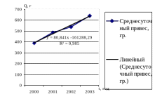 | Среднесуточный привес, г. | 390,22 | 487,93 | 539,11 | 642,63 | 164,68 | 252,41 | |
