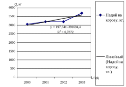 Рассматривая продуктивность крупнорогатого скота, видно, что наблюдается тенденция роста (табл.11). Валовые надои молока за 4 года увеличились на 86149 ц (530,54%), валовой привес – на 6198,49 ц (562,99%), надои молока на корову по сравнению с 2000 годом увеличились на 21,50% и составляют 3701,63 кг, среднесуточный привес увеличился на 64,68% и составил 642,63 г.