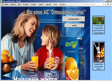 Щоб розпочати роботу з АІС, необхідно запустити файл АІС-Оптимальний запас.xls. У вікні системи з’явиться вікно „Заставка” (рис. 4.1)