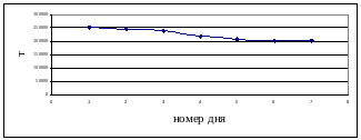 Для построения зависимости потребления угля по дням, найдем среднее значения потребления по каждому дню. Для этого просуммируем потребление угля по каждому номеру дня в течение всего года, и разделим это значение на количество дней. Таким образом, мы получим диапазон потребления угля с 1 по 7 день, который показывает среднее значения потребления. Полученный график представлен на рисунке 2.5