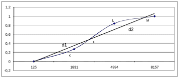 Для каждого значения середины интервала определим среднее значение экспериментальной функции распределения F(x). Получим результативные данные, приведенные в таблице А.1 приложения А