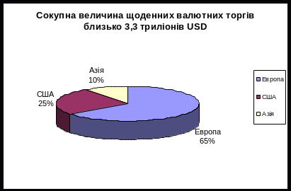 - комерційні банки – роблять основний об'єми торгів (90-95%) на валютному ринку (рис.1.1.), здійснюючи конверсійні операції, як на користь своїх клієнтів, так і в своїх. Це такі банки, як Deutsche Bank, Barclays Bank, Union Bank of Switzerland, Citibank, Chase Manhattan Bank, Standard Chartered Bank та інші.