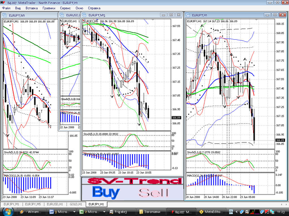 while (counterZ { res=SV-TrendBuffer[i]; if (res!=0) counterZ++; i++; } i--; limit=i; if (LowMapBuffer[i]!=0) { curlow=LowMapBuffer[i]; whatlookfor=1; } else { curhigh=HighMapBuffer[i]; whatlookfor=-1; } for (i=limit-1;i>=0;i--) { SV-TrendBuffer[i]=0.0; LowMapBuffer[i]=0.0; HighMapBuffer[i]=0.0; } } for(shift=limit; shift>=0; shift--) { val=Low[iLowest(NULL,0,MODE_LOW,ExtDepth,shift)]; if(val==lastlow) val=0.0; else { lastlow=val; if((Low[shift]-val)>(ExtDeviation*Point)) val=0.0; else { for(back=1; back<=ExtBackstep; back++) { res=LowMapBuffer[shift+back]; if((res!=0)&&(res>val)) LowMapBuffer[shift+back]=0.0; } } } if (Low[shift]==val) LowMapBuffer[shift]=val; else LowMapBuffer[shift]=0.0; //--- high val=High[iHighest(NULL,0,MODE_HIGH,ExtDepth,shift)]; if(val==lasthigh) val=0.0; else { lasthigh=val; if((val-High[shift])>(ExtDeviation*Point)) val=0.0; else { for(back=1; back<=ExtBackstep; back++) { res=HighMapBuffer[shift+back]; if((res!=0)&&(res } } } if (High[shift]==val) HighMapBuffer[shift]=val; else HighMapBuffer[shift]=0.0; } // final cutting if (whatlookfor==0) { lastlow=0; lasthigh=0; } else { lastlow=curlow; lasthigh=curhigh; } for (shift=limit;shift>=0;shift--) { res=0.0; switch(whatlookfor) { case 0: // look for peak or lawn if (lastlow==0 && lasthigh==0) { if (HighMapBuffer[shift]!=0) { lasthigh=High[shift]; lasthighpos=shift; whatlookfor=-1; SV-TrendBuffer[shift]=lasthigh; res=1; } if (LowMapBuffer[shift]!=0) { lastlow=Low[shift]; lastlowpos=shift; whatlookfor=1; SV-TrendBuffer[shift]=lastlow; res=1; } } break; case 1: // look for peak if (LowMapBuffer[shift]!=0.0 && LowMapBuffer[shift] { SV-TrendBuffer[lastlowpos]=0.0; lastlowpos=shift; lastlow=LowMapBuffer[shift]; SV-TrendBuffer[shift]=lastlow; res=1; } if (HighMapBuffer[shift]!=0.0 && LowMapBuffer[shift]==0.0) { lasthigh=HighMapBuffer[shift]; lasthighpos=shift; SV-TrendBuffer[shift]=lasthigh; whatlookfor=-1; res=1; } break; case -1: // look for lawn if (HighMapBuffer[shift]!=0.0 && HighMapBuffer[shift]>lasthigh && LowMapBuffer[shift]==0.0) { SV-TrendBuffer[lasthighpos]=0.0; lasthighpos=shift; lasthigh=HighMapBuffer[shift]; SV-TrendBuffer[shift]=lasthigh; } if (LowMapBuffer[shift]!=0.0 && HighMapBuffer[shift]==0.0) { lastlow=LowMapBuffer[shift]; lastlowpos=shift; SV-TrendBuffer[shift]=lastlow; whatlookfor=1; } break; default: return; } } return(0); } //+------------------------------------------------------------------+ 4.2 Приклад інтерфейсу Індикатор добавляється як і всі інші, - через «Головне меню» → Вставка → Індикатори → Осцилятори → «SV-Trend» Індикатор працює на всіх періодах, які підтримує «Meta| Trader| 4». Незважаючи на складність ідеї та обширність розробки індикатора, – працює він дуже просто: коли індикатор прогнозує спадаючий тренд, в наступному періоді, червоним кольором індукується «Sell»(рис. 4.1.), а при прогнозі зростаючого тренду уже синім кольором індукується «Buy» Індикатор «SV-Trend» - являе собою не тільки гріфічне представлення запропонованого методу, а ще і удосконаленням технічних характеристик, так як він дає можливість обнови вхідник даних, – а це означає збільшення єкономічного ефекту. Рис. 4.1. Приклад інтерфуйсу програми «Meta| Trader| 4» з индикатором «SV-Trend» 5. Охорона праці 5.1 Інженерний - технічні заходи 5.1.1 Шкідливі і небезпечні чинники при роботі з ПК і їх вплив на організм людини В даний час ПЕВМ широко застосовуються в різних областях людської діяльності, що дозволяє звільнитися від виконання великої кількості рутинних операцій і підвищити продуктивність праці. Не дивлячись на всі позитивні аспекти масового розповсюдження ПЕВМ існує і ряд негативних чинників, виявлення яких, оцінка впливу на людину і розробка мерів по їх усуненню або мінімізації є актуальними завданнями на сьогоднішній день. На нашому підприємстві можна виділити наступні: 1) Дисплеї виконані на електронно-променевих трубках, є потенційним джерелом м'якого рентгенівського, ультрафіолетового, інфрачервоного, видимого, радіочастотного, сверх- і низькочастотного електромагнітного випромінювань. 2) Нізькоінтенсивні електромагнітні випромінювання мають місце на робочих місцях користувачів ПК, які не перевищують допустимих значень електричних і магнітних полів для діапазону частот бОкГц - ЗООмгц. Максимальний рівень напруженості електричного поля реєструється у задньої панелі дисплея і декілька менше на відстані 10 см від екрану і корпусу дисплея. 4) Віз