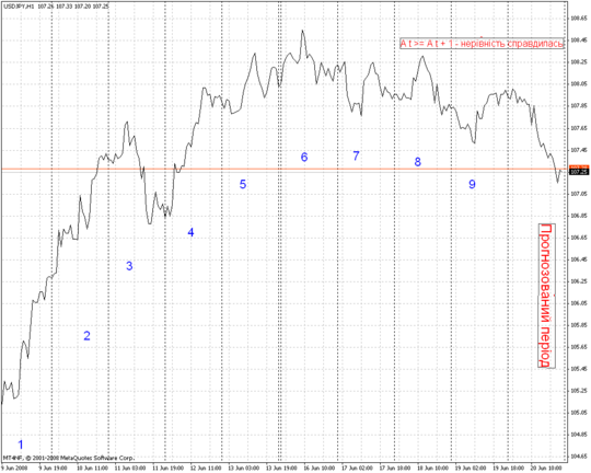 Нехай у нас є 10-ть проміжків часу – ми беремо 9-ть, прогнозуємо і спів ставляємо історію крос-курсу з виданим прогнозом кібернетичної моделі (рис. 3.4.).