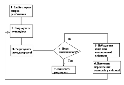 Циклом у транспортній таблиці називаються декілька клітин, сполучених замкнутою ламаною лінією, що повертає на 90° в окремих клітинах. Цикл будують так, щоб одна його клітина була у вільній клітині, інші вершини в базисних (заповнених) клітинах. Алгоритм методу показаний на рисунку 2.1.