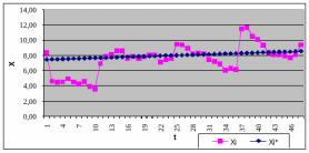 В результаті рішення системи рівнянь (2.9) обчислюємо значення параметрів a0, a1 і a2 і одержуємо поліном при параболічній апроксимації Х*= 11,32-0,35*t-0,01*t2. Представляємо графічне зображення отриманого рішення на рисунку3.2.