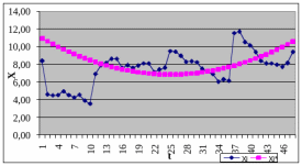 У результаті рішення системи рівнянь обчислюємо значення параметрів a0 і a1 і одержуємо поліном при гіперболічній апроксимації: X*=8,57-5,35*1/t. Представляємо графічне зображення отриманого рішення на рисунку 3.3