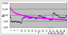 В результаті рішення системи рівнянь обчислюємо значення параметрів a0 і a1 і одержуємо поліном при напівлогарифмічній апроксимації: X*=15,94-5,82*logt. Представляємо графічне зображення отриманого рішення на рисунку 3.4.