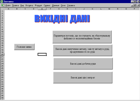 Як видно з рис. 3.2 головне меню системи містить у собі підміню вихідні дані (рис. 3.3). Цей додаток містить вихідні дані, а саме: параметри потоків, що поступають на збагачувальну фабрику із експлуатаційних блоків; базові дані вилучення металу, зміст металу в руді, продуктивності по руді; базові дані змісти металу в концентраті, видобутку руди; базові дані цін і витрат за 2003, 2004, 2005 року. Ці дані обробляються і використовуються в якості вхідних перемінні моделі. При зміні вихідних даних міняються результати моделі.