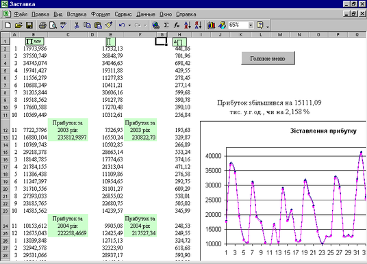 Для керування окремими частинами додатка використовується основна керуюча форма – головне меню (рис. 3.2). Головним меню є форма, у яку користувач попадає при натисканні кнопки "Старт" заставки. На ній відображається назва головного меню й елементи керування, що дозволяють переміщатися до різних складових частин додатка, з яких, у свою чергу, обов'язково реалізовані переходи назад у головне меню. Найбільш ефективний і наочним для основного меню є кнопковий інтерфейс робочого листа.