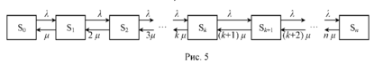 Сравнивая графы на рис. 3 и на рис. 5 легко увидеть, что многоканальная СМО с отказами является частным случаем системы рождения и гибели, если в последней принять