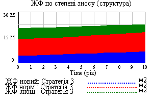 З графіків видно, що при стратегії №3 «Будуємо і ремонтуємо» об'єм нормального житлового фонду спочатку залишається постійним, а потім починає помітно рости за рахунок капітального ремонту зношеного житла. Об'єм нового житла рівномірно росте із збереженням своєї частки в загальній площі житлового фонду. Темпи будівництва нового житла рівномірно знижуються.