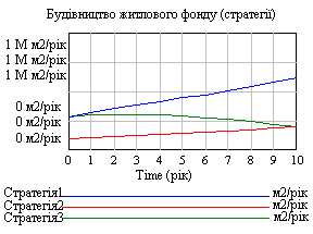 Після проведення експериментів на імітаційній моделі були одержані наступні результати. Темпи будівництва житлового фонду при 3 стратегіях приведені на рисунку 3.2: