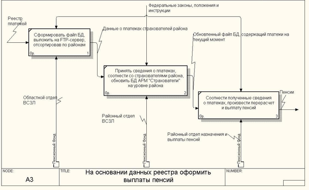 В областном отделе ВСЗЛ формируются файлы БД для районов, в которых платежи разнесены по страхователям, Рис 2.2. Далее, районные отделы ВСЗЛ, обновив свои базы данных АРМ «Страхователь», формируют исходные данные для отдела назначения и выплаты пенсий. Отдел назначения, соотнеся имеющиеся сведения о платежах страхователей, перечисляют на лицевые счета застрахованных лиц средства для выплаты пенсий.