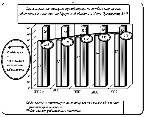 Снижение численности работающих негативно сказывается и на финансовом обеспечение пенсионной системы, если в 2005 году на 100 работающих приходилось 75 пенсионера, то за 9 месяцев 2009г. уже 87 пенсионеров и при складывающейся демографической ситуации данная тенденция год от года будет только ухудшаться (см. рис 2.3.).