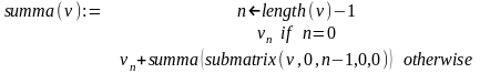 рекурсивно по своей сути. Сумма n слагаемых есть сумма первых (n1)-го слагаемого плюс сумма последнего слагаемого. Этот факт и положен в основу определения функции summa(v), где v=(a0,a1,…,an1)T.