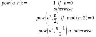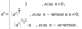Отсюда сразу же получаем алгоритм вычисления an, требующий не более log2(n) рекурсивных вызовов. Реализуется он функцией pow(a,n):