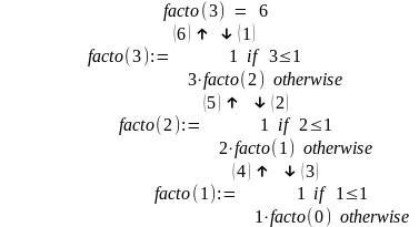 Понять процесс реализации рекурсивных вызовов, то есть декомпозицию, и возвратов управления при организации отложенных вычислений facto(n) можно из схемы рис. 3.1 (n = 3). Там около стрелок в круглых скобках жирными цифрами указаны номера последовательных шагов вычислений: (1), (2), (3) декомпозиция; (4), (5), (6) отложенные вычисления.