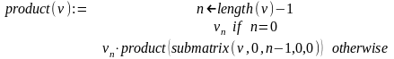 как и соответствующее определение суммы, рекурсивно по своей сути. Произведение n сомножителей есть произведение первых (n1)-го сомножителей умноженное на последний сомножитель. Отсюда и определение функции product(v), где v=(a0,a1,…,an1)T.