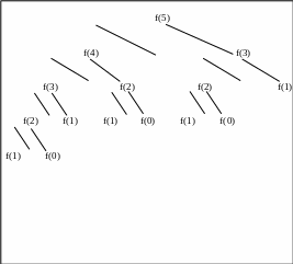 Функция fib(n) вряд ли подходит для вычисления чисел Фибоначчи при больших n. И происходит это потому, что в данном случае с ростом n дерево рекурсивных вызовов очень быстро разрастается. На рис. 3.3 представлена схема рекурсивных вызовов для fib(5) (имя функции обозначено через f).